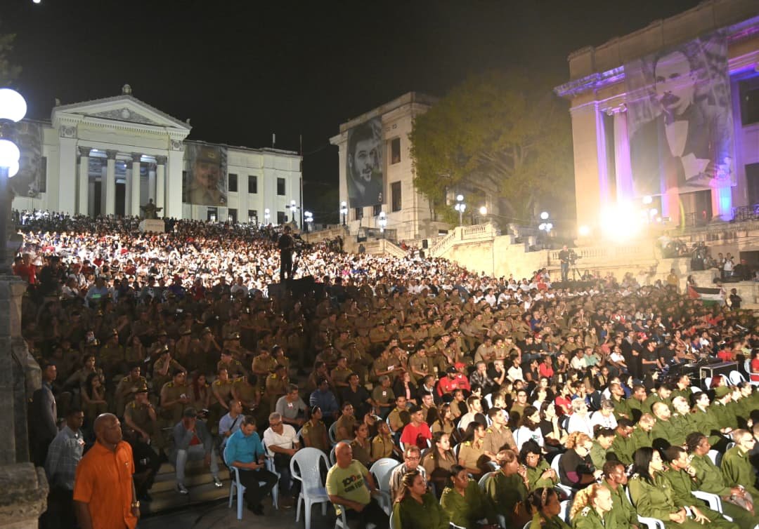«Vibrante del compromiso siempre joven, desde aquí, confirmamos que tu luz nunca se irá. No se irá de la mirada de tus jóvenes. No se irá de ningún rincón del mundo. No se irá del corazón latente de tu pueblo. Pero hoy no hablamos solo de un hombre, hoy hablamos de un símbolo que se hizo carne en nuestra historia», señaló la primera secretaria del comité nacional de la UJC, Meyvis Estévez Echeverría, en las palabras centrales de la velada.