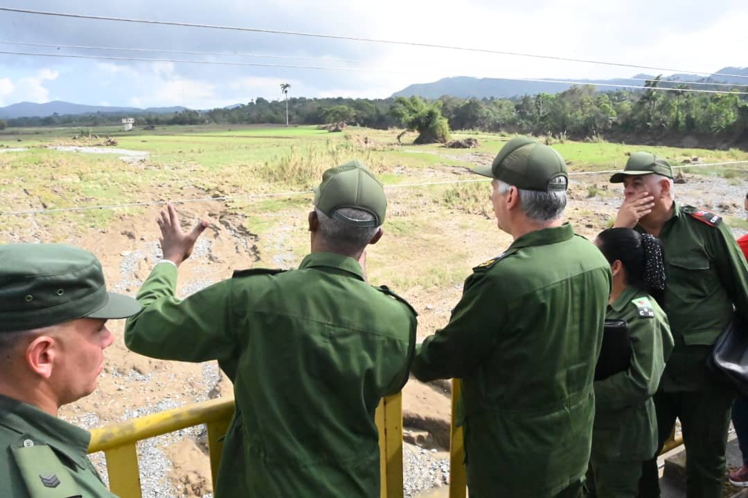 En su recorrido de este viernes, el Jefe de Estado llegó también hasta el municipio de Sagua de Tánamo, igualmente impactado por las inundaciones. Estuvo en el puente sobre el río que da nombre al lugar, en perfecto estado constructivo, pero desde donde se podía ver la devastación en su margen izquierda, lugar en el que había tres pozos para el abasto de agua a los más de 41 000 habitantes del municipio: hoy colapsados. El presidente del Consejo de Defensa Provincial, Joel Queipo Ruiz, explicó que se han buscado alternativas en otras fuentes para mantener el servicio al poblado, y se construye otro pozo en una zona alta, porque como dijo el mandatario no tiene sentido mantener el bombeo tan pegado al río y que vuelva a desplomarse en otro momento.