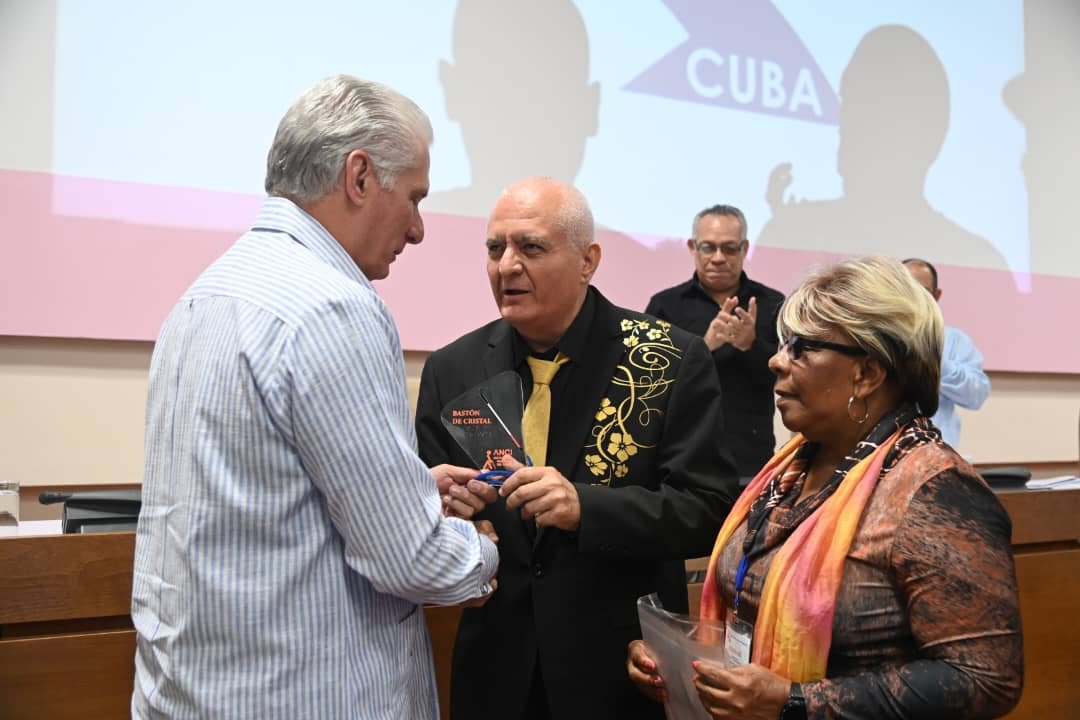 Momento de especial significación devino la entrega al Presidente Díaz-Canel del “Bastón de Cristal”, máxima condecoración que otorga la ANCI a personalidades y asociados que han contribuido con su trabajo, ejemplo y actuación a la inclusión social efectiva de las personas con discapacidad visual.
